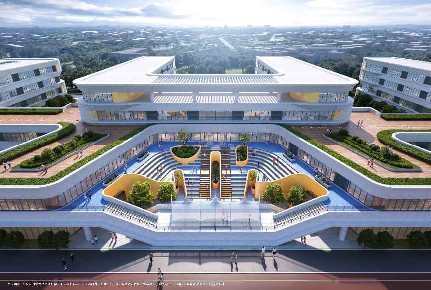 会展北九年一贯制学校规划为36班公办建制,高标准配建了科创实验室、艺术专用教室、室内体育馆、学生礼堂等全维度素质教育场地,搭配高绿化、优采光的生态环境。校园采用了科学分区设计,教学区、运动区、生活区布局合理、动静分离,立体连廊串联起各个功能区间,为孩子们打造了舒适、现代的成长空间。