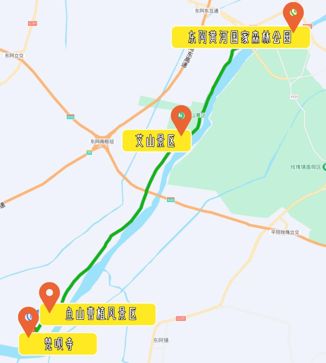 游览路线:东阿黄河国家森林公园 → 艾山景区 → 鱼山曹植景区 → 梵呗寺。