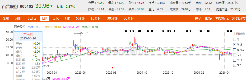 市场表现方面,2025年报披露后次日,百合股份股价开盘即下跌,至上午收盘,报收40.12元/股,下跌2.48%。2025年4月16日至2026年4月15日的一年间,百合股份股价累计上涨1.63%。