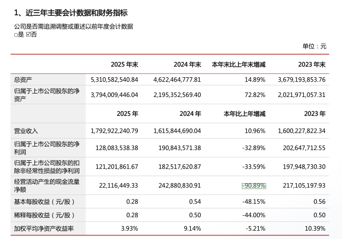 根据年报披露,南山智尚2025年呈现出明显的“增收不增利”特征。全年实现营业收入约17.93亿元,同比增长10.96%;但归属于上市公司股东的净利润约为1.28亿元,同比大幅下降32.89%;扣除非经常性损益后的净利润同比下降33.59%。更为严峻的是,经营活动产生的现金流量净额同比锐减90.89%。