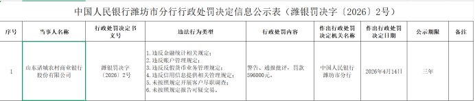 凤凰网山东(报料微博@凤凰网山东)从中国人民银行山东省分行官网获悉,山东诸城农村商业银行因存在违反反假货币业务管理规定等6项违法行为,被警告、通报批评并罚款59.6万元,处罚决定日期为4月14日。