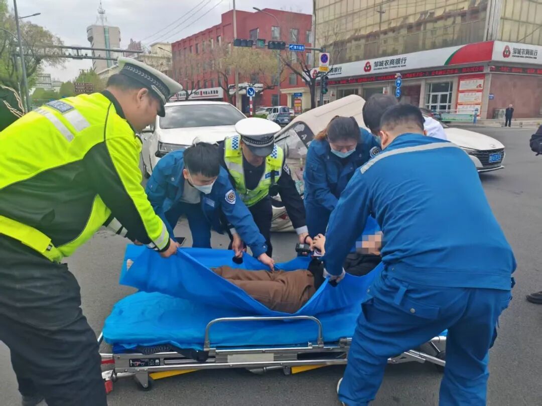 邹城市公安局交通管理大队勤务一中队民辅警巡逻至邹城市太平路与凤凰山路口交汇处时,发现一辆电动三轮车与一辆轿车发生交通事故,电动三轮车驾驶员被甩出车外。民辅警立即下车维护现场秩序,严防二次事故发生,同时对受伤人员进行保护,并第一时间拨打120急救电话。待120急救人员抵达现场后,民辅警协助医护人员将受伤人员抬上救护车,为救治争取了宝贵时间。
