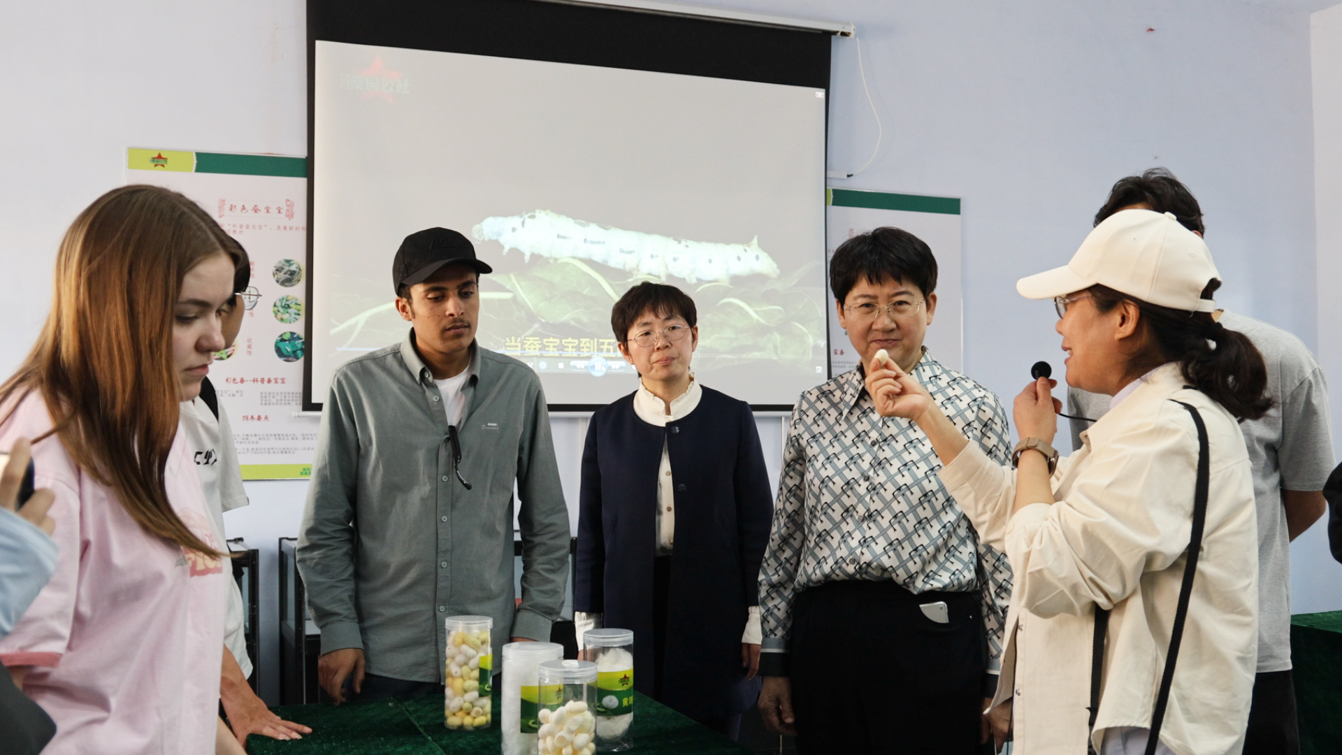 “一株桑”不仅串起了产业链 ,更传承了中国千年的匠心智慧。在互动体验区,国际学生们亲自动手体验了手工缫丝的传统技艺。看着纤细坚韧的蚕丝从蚕茧中被缓缓抽出,大家连连称奇。随后,讲解员还为大家科普了蚕丝在现代科技研发中的多种创新用途,展现了传统产业与现代科技的融合。