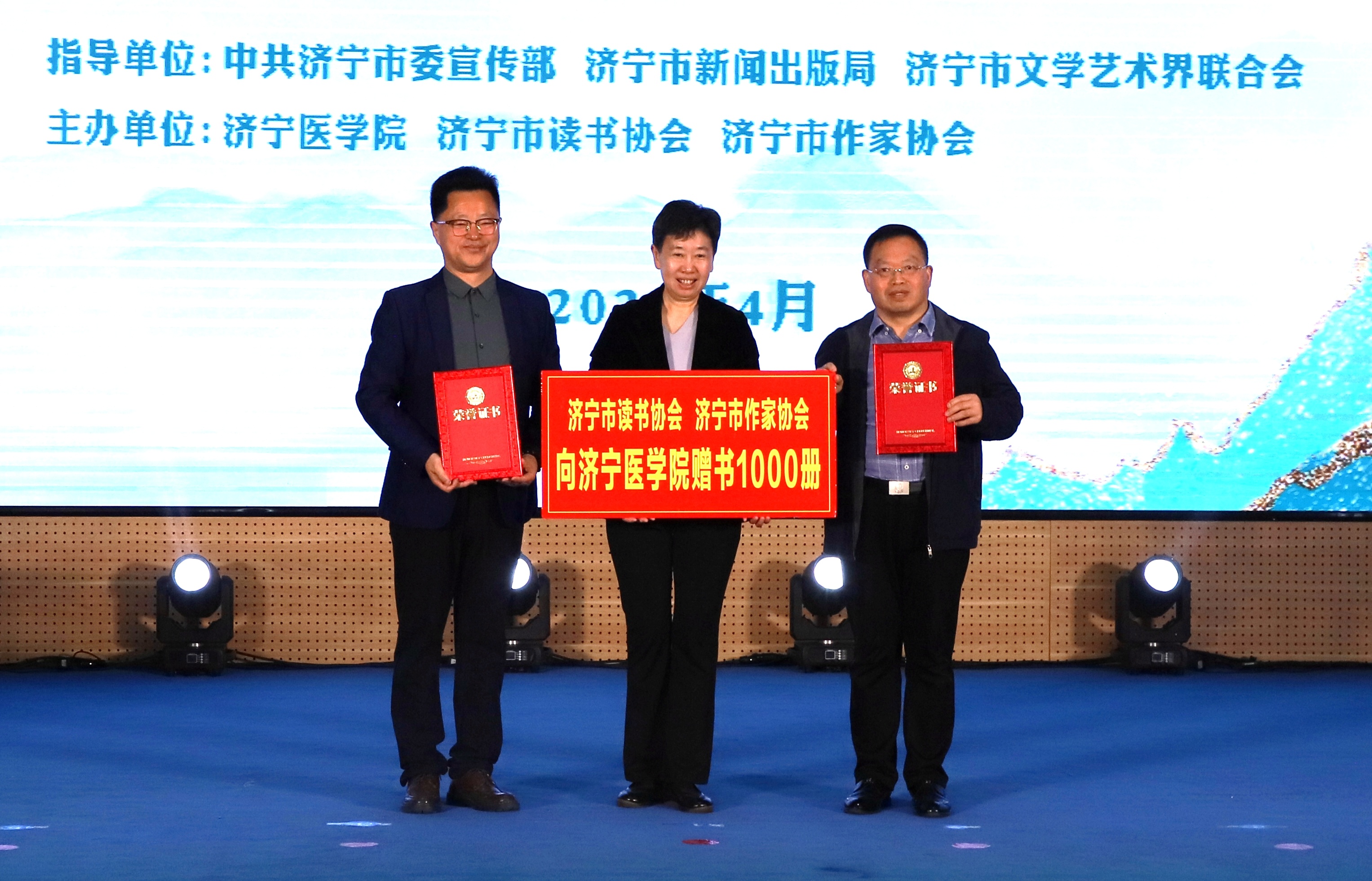 赠书环节中,济宁市作家协会副主席兼秘书长周中祥、济宁市读书协会会长郭玉向济宁医学院赠送图书一千余册,王文姮代表学校接受赠予并颁发荣誉证书。随后,济宁市书法家协会副主席王超与卢国华共同展示了“青衿传儒韵·书香济医魂”书法长卷。