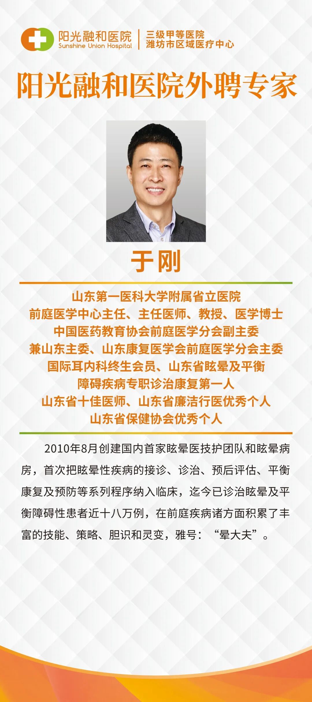 于刚教授:山东省立医院前庭医学中心主任、主任医师、教授、医学博士、中国医药教育协会前庭医学分会副主委兼山东主委、山东省眩晕及平衡障碍疾病专职诊治康复第一人。