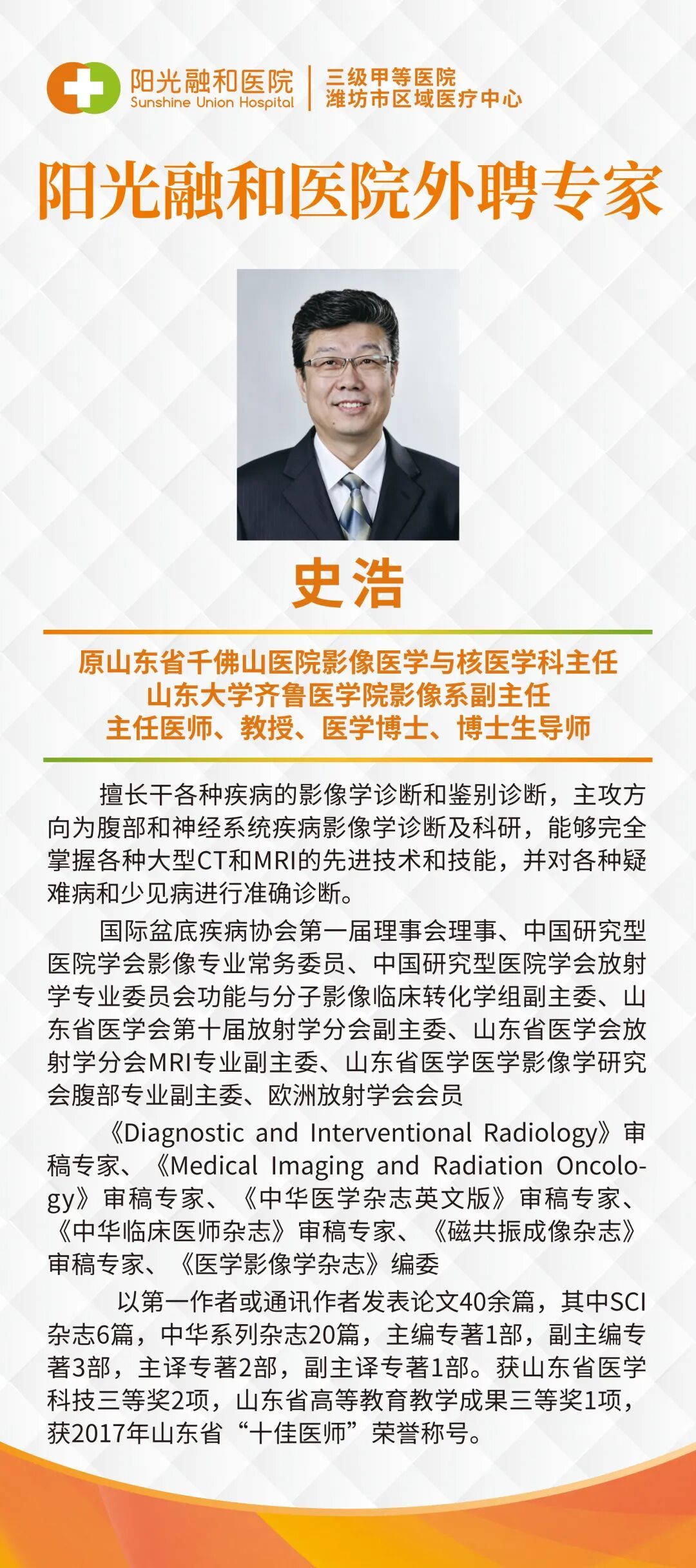 史浩教授:原山东省千佛山医院影像医学与核医学科主任、山东大学齐鲁医学院影像系副主任,主任医师、教授、医学博士、博士生导师。