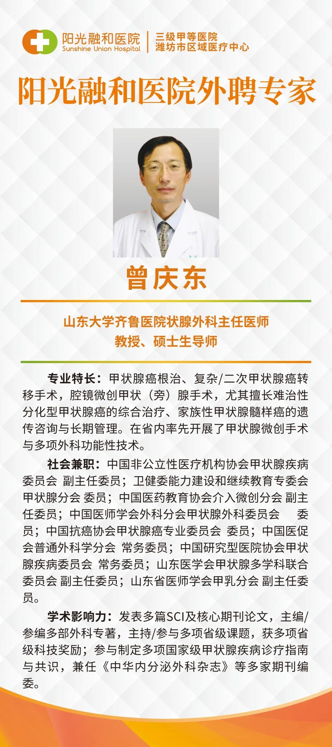 曾庆东教授:山东大学齐鲁医院甲状腺外科主任医师、教授、硕士生导师。