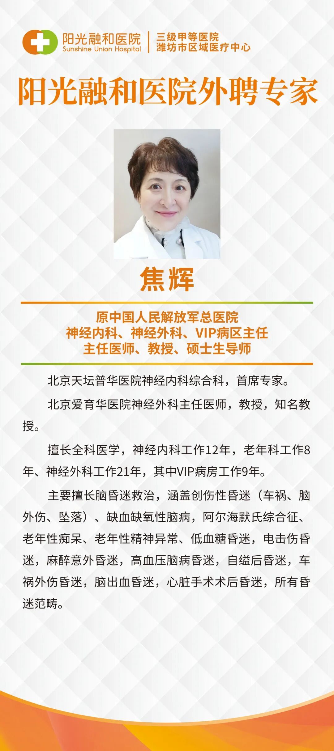 焦辉教授:原中国人民解放军总医院神经内科、神经外科、VIP病区主任,主任医师、教授、硕士生导师。