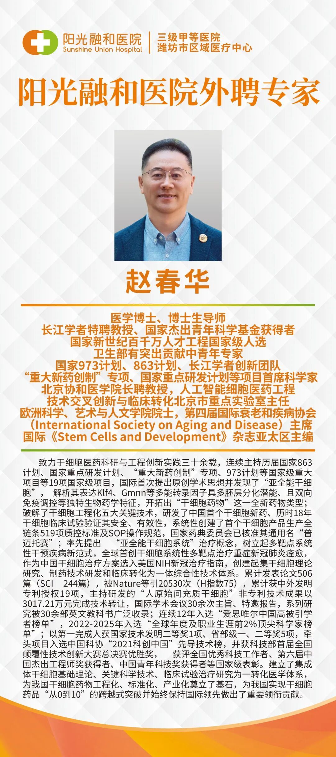 赵春华教授:欧洲科学、艺术与人文学院院士,北京协和医学院长聘教授,人工智能细胞医药工程技术交叉创新与临床转化北京市重点实验室主任、医学博士、博士生导师。