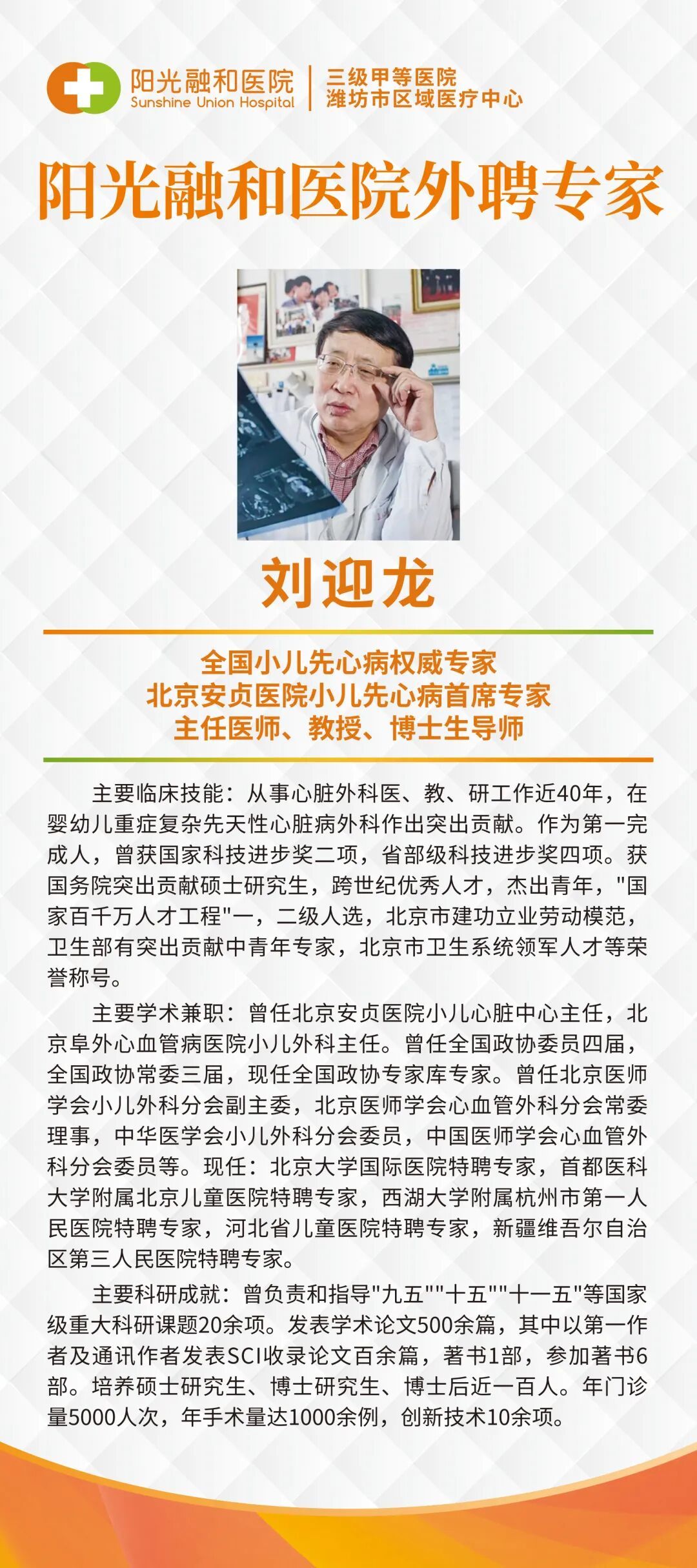 刘迎龙教授:全国小儿先心病权威专家、北京安贞医院小儿先心病首席专家,主任医师、教授、博士生导师。