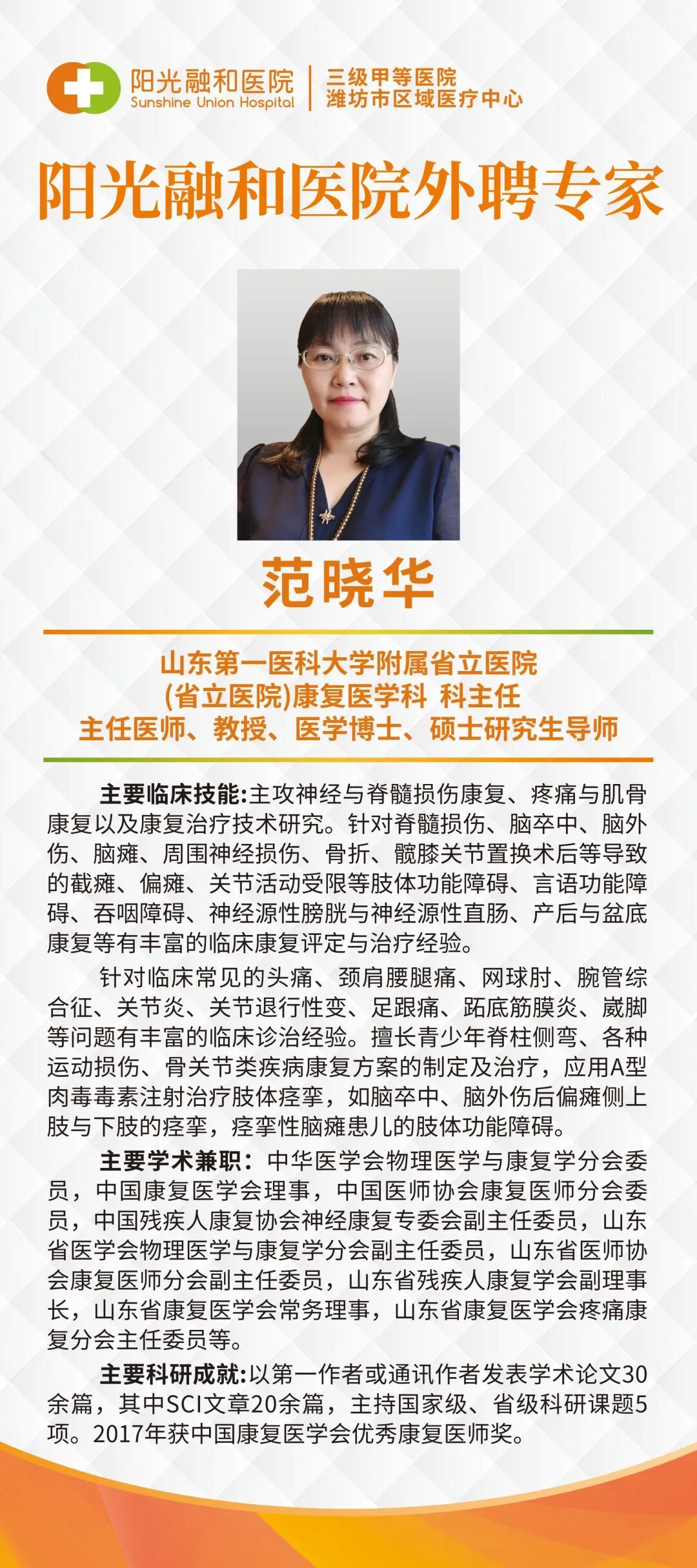范晓华教授:山东省立医院康复医学科主任,山东第一医科大学硕士研究生导师、主任医师、博士。