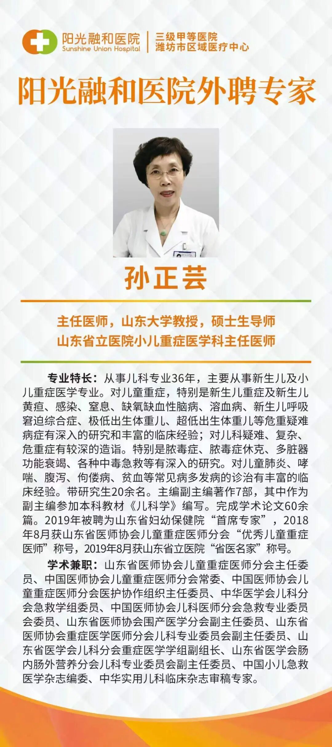 孙正芸教授:主任医师,山东大学教授,硕士生导师、山东省立医院小儿重症医学科主任医师。