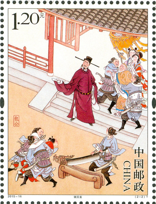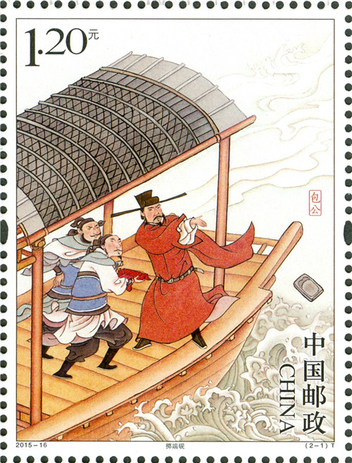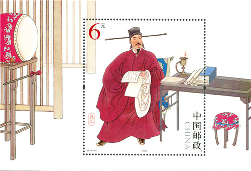 中国邮政定于2015年8月8日发行《包公》特种邮票1套2枚,小型张1枚,邮票内容分别为(2-1)掷端砚1.20元,(2-2)铡美案1.20元;小型张内容为包公像6元。全套邮票面值为8.40元。另:特别制作《包公》小型张四连张一枚,材质为绢质,面值24元,整张规格294×214毫米。